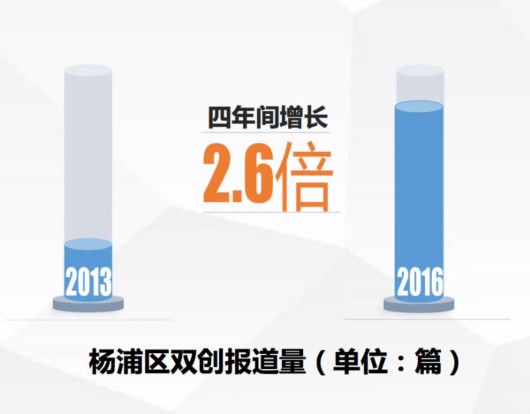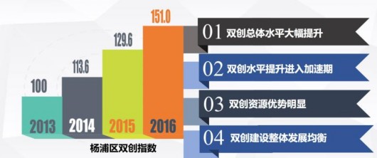 經(jīng)過指標(biāo)測算顯示,以2013年作為基期,楊浦區(qū)“雙創(chuàng)指數(shù)”從2013年的100(基期賦值)上升至2016年的151.0,增幅高達51%。其中,2016年較上年增長16.5%,成為歷年增速增長高的一年,雙創(chuàng)發(fā)展增速逐年提升。此外,各分項指數(shù)也均有提高,其中以雙創(chuàng)影響指數(shù)增長為強勁,從2013年的100增長到了2016年的153.1,較上年增長22.8%。“雙創(chuàng)影響力和成果的增幅比要素和環(huán)境明顯,這也表明,創(chuàng)新的要素和環(huán)境需要長時間的投入來改善,創(chuàng)新創(chuàng)業(yè)的發(fā)展需要積極進取,還需要厚積薄發(fā)、沉得住氣。”楊浦區(qū)發(fā)改委張?zhí)鞜槺硎?。報告顯示,近年來楊浦區(qū)各類雙創(chuàng)載體面積(含老廠房改造)持續(xù)擴大,截至2016年,楊浦區(qū)各類雙創(chuàng)載體面積已達到162.3萬平方米,其中,科技園區(qū)(含老廠房改造)面積占據(jù)各類雙創(chuàng)載體總面積的94.3%。同時,如長陽創(chuàng)谷等園區(qū)的品牌效應(yīng)逐漸形成和擴散,服務(wù)能級不斷提升。與此同時,市級以上眾創(chuàng)空間備案數(shù)占上海比例呈逐年上升態(tài)勢。至2016年,楊浦已初步建成各類“眾創(chuàng)空間”61家,約占上海市總量的12%。其中,國家級眾創(chuàng)空間授牌為9家,占全市的20.5%;市級眾創(chuàng)空間授牌為16家,占全市的14%。