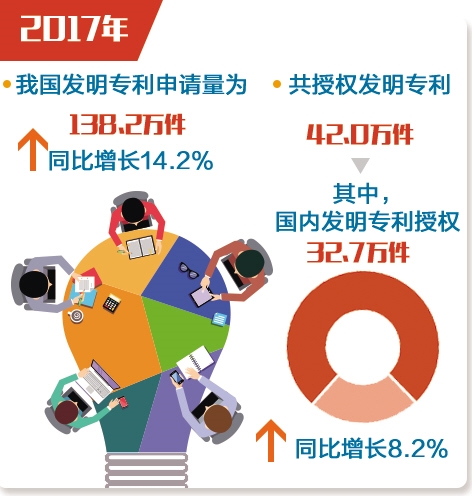 近日,國家知識產權局發布了2017年我國發明專利有關情況和企業排名。數據顯示,2017年,我國發明專利申請量為138.2萬件,同比增長14.2%。共授權發明專利42.0萬件,其中,國內發明專利授權32.7萬件,同比增長8.2%。專利事業迸發出量質齊升的澎湃動力,從知識產權大國邁向知識產權強國的步伐更加堅實有力。