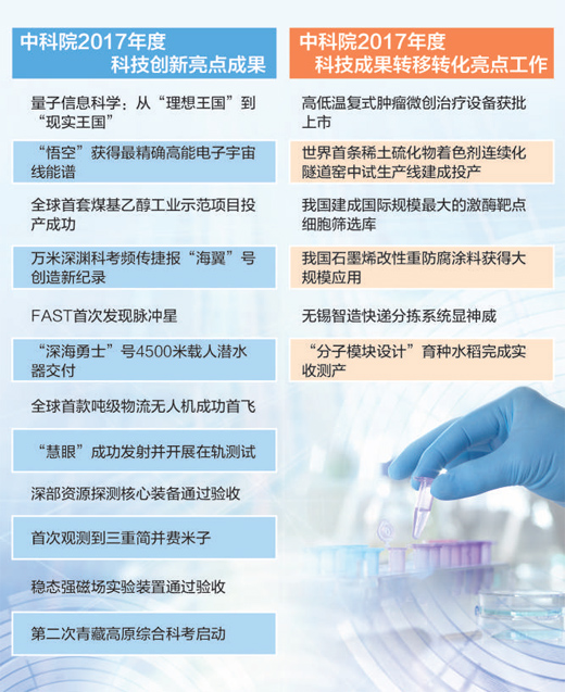 日前,量子信息科學(xué):從“理想王國”到“現(xiàn)實(shí)王國”;“悟空”獲得精確高能電子宇宙線能譜等12項(xiàng)獲中科院2017年度科技創(chuàng)新亮點(diǎn)成果。高低溫復(fù)式腫瘤微創(chuàng)治療設(shè)備獲批上市;世界首條稀土硫化物著色劑連續(xù)化隧道窯中試生產(chǎn)線建成投產(chǎn)等6項(xiàng)獲科技成果轉(zhuǎn)移轉(zhuǎn)化亮點(diǎn)工作。