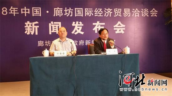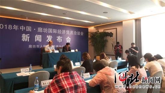 5月14日上午,2018年中國(guó)·廊坊國(guó)際經(jīng)濟(jì)貿(mào)易洽談會(huì)召開(kāi)第二次新聞發(fā)布會(huì)。圖為會(huì)議現(xiàn)場(chǎng)。通訊員李松潔攝