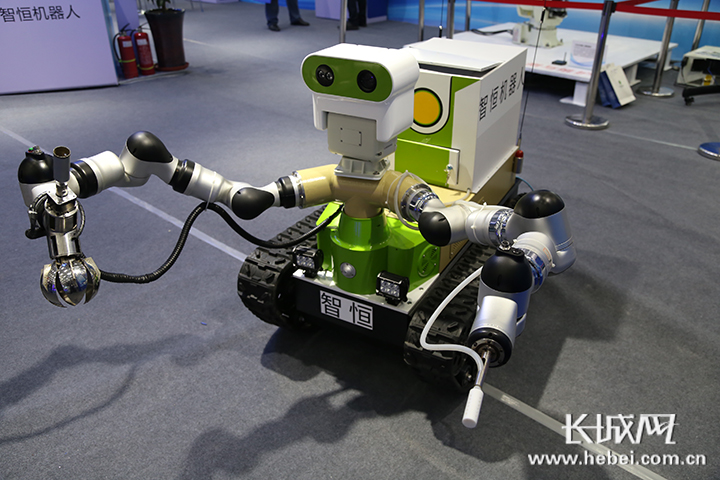 2018年“5·18”經(jīng)洽會大智移云展上的環(huán)保應(yīng)急偵測特種機(jī)器人。記者周亞彬攝